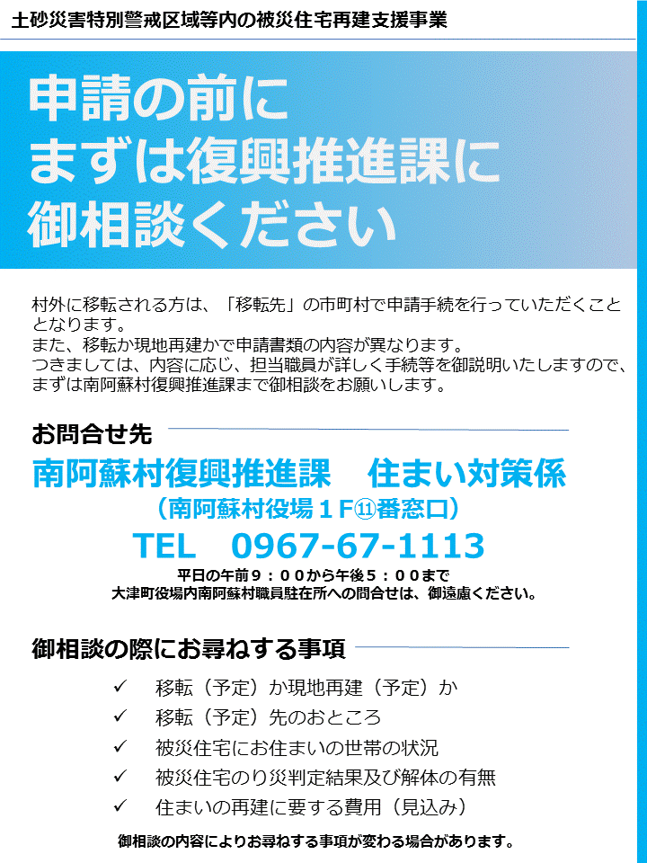 南阿蘇村土砂災害特別警戒区域等(レッドゾ-ン)等内にお住いの方へ 最終更新日:2017年10月31日 印刷 南阿蘇村土砂災害特別警戒区域(レッドゾーン)等内の被災住宅再建支援事業(復興基金事業)実施のお知らせ 目的 本事業は、平成28年熊本地震復興基金を活用して、平成28年熊本地震により被害を受けた土砂災害特別警戒区域等内の被災住宅の再建に要する費用の一部を補助することにより、被災された方の早期の住宅再建と負担軽減を図ることを目的としています。 対象となる方 土砂災害特別警戒区域等内に区域指定又は基礎調査の結果の公表前から居住し、平成28年熊本地震により被災者生活再建支援制度の対象となり住宅の再建(移転・建替え)が必要となった世帯の代表者 支援内容 【 住宅移転費支援事業 】 土砂災害特別警戒区域等外への移転する場合に要する次に揚げる費用の一部を補助するものです。経費の内容補助額住宅除却費等被災住宅の除却、動産の移転及び仮住居に要する経費(がけ地近接等危険住宅移転事業補助金を受ける場合は、これらの経費から同補助金の額を控除する。)最高300万円 移転経費土砂災害特別警戒区域等からの移転に当たり必要な建築確認等手続費用、登記費用、火災保険加入料その他の住宅の建設又は購入に付帯して要する経費賃貸住宅への入居に要する経費及び賃貸費(1年間分に限る。)住宅の建設、購入又は改修に要する経費新たな住宅の建設又は購入に要する経費移転先の土地購入に要する経費移転先の住宅の改修に要する経費土地の調査費がけ地近接等危険住宅移転事業の適用に関する検討に必要ながけの状況の調査資料作成に要する経費 【 住宅補強費支援事業 】 土砂災害特別警戒区域等内に住宅を現地再建する場合に要する次に揚げる費用の一部を補助するものです。経費の内容補助額工 事 費住宅補強工事の施工に要する経費 対象経費の2分の1相当額(最高150万円)設 計 費住宅補強工事の設計に要する経費 チラシ (PDF:532.1キロバイト) 申請の前に [その他のファイル/129KB] リンク ※ 『土砂災害特別警戒区域』は、熊本県が「土砂災害警戒区域等における土砂災害防止対策の推進に関する法律」に 基づき指定するものです。 ※ お住まいの家屋が土砂災害特別警戒区域内にあるかどうかは、熊本県のホームページで確認できます。 ⇒ 熊本県土砂災害情報マップ 様式のダウンロード ・ 南阿蘇村土砂災害特別警戒区域等内の被災住宅再建支援事業補助金交付要綱 (PDF:195.1キロバイト) ・ 補助金交付申請書(住宅移転費支援事業用) (ワード:21.3キロバイト) ・ 補助金交付申請書(住宅補強費支援事業用) (ワード:21キロバイト) ・ 承諾書(被災住宅の所有者が複数の場合に提出) (ワード:19.5キロバイト) ・ 跡地管理誓約書 (ワード:19.7キロバイト) ・ 変更承認申請書 (ワード:19.9キロバイト) ・ 実績報告書(住宅移転費支援事業用) (ワード:20.8キロバイト) ・ 実績報告書(住宅補強費支援事業用) (ワード:20.5キロバイト) ・ 補助金交付請求書 (ワード:20.2キロバイト)